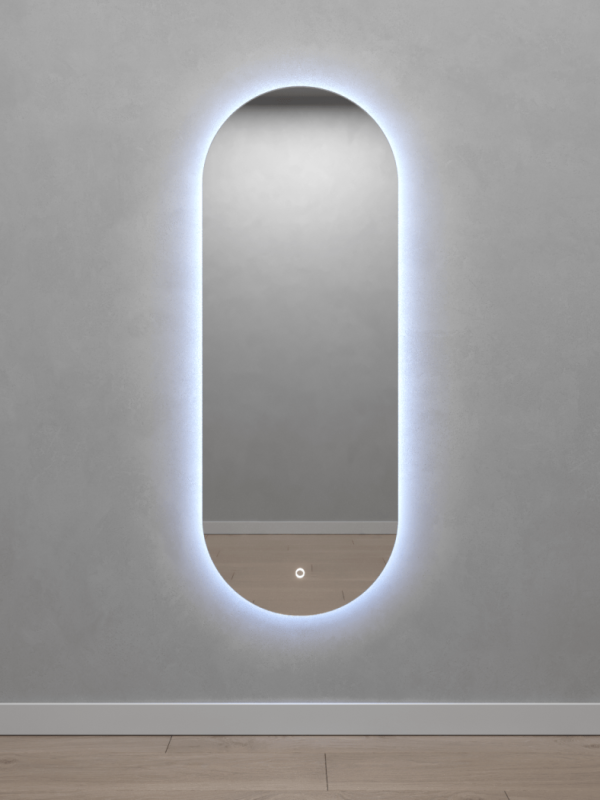 Безрамное зеркало овальной (капсульной) формы с контурной (тыльной) холодной подсветкой, свет 6000К. Подложка из высококачественного МДФ, светодиодная лента защищена матовым свето-рассеивателем от попадания пыли и влаги. Есть вывод 220W для подключения к сети, включение подсветки от выключателя на стене, либо от розетки.