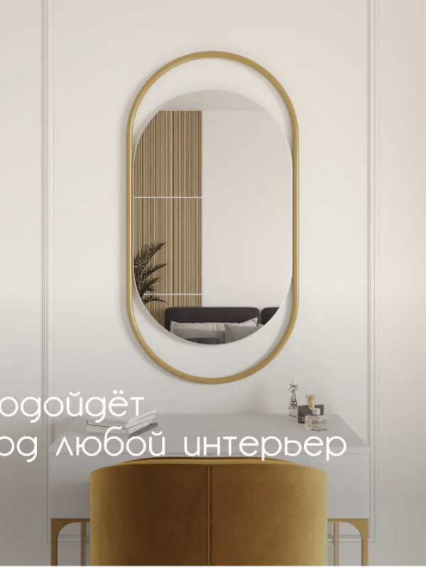 Зеркало «Muse». Артикул GMZ-02-1-1/2/3 Идеальная симметрия и простая изысканность ар-деко в виде овального настенного зеркала в металлической раме способны дополнить интерьер, выполненный в любом стиле, начиная от винтажного и заканчивая авангардным. Зеркальное полотно является продукцией известного бельгийского производителя AGC, который славится непревзойдённым качеством своих зеркал. Идеально подходит для ванной комнаты или спальни.Характеристики:– профиль рамы круглый, диаметром 20 мм; – габариты – 1040х540х20 мм; – размер зеркального полотна – 800х500 мм, толщина – 4 мм; – вес – 7 кг; – устойчивая матовая порошковая окраска; – возможные цвета – золотой, чёрный, белый; – саморезы для крепления к стене в комплекте; – гарантия – 1 год.